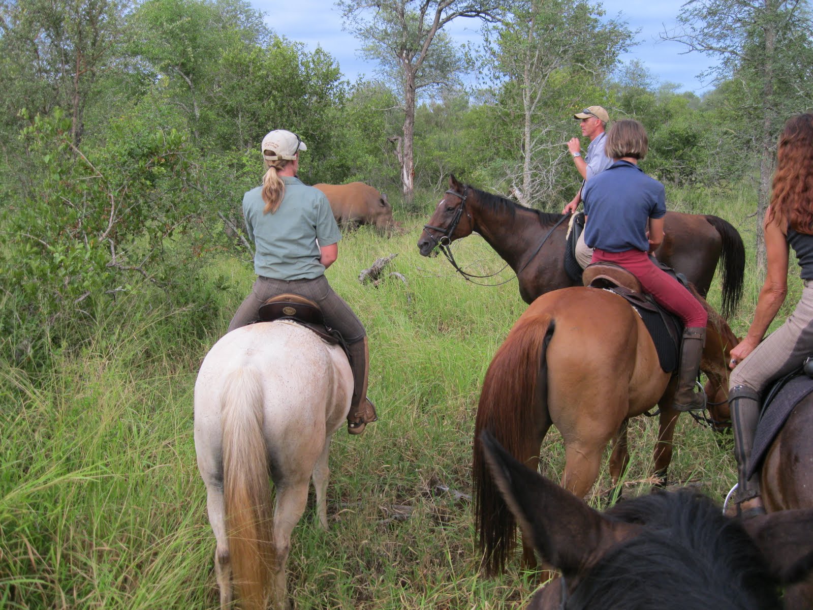 Wednesday, Thursday, and Friday morning off to Makilali--a neighboring animal reserve. Riding from Wait A Little to the fence line, "crossing the street", and onto the next door neighbors property. Most of the animal population is the same, but the animals are less use to seeing horses/riders, so they are more likely to use their flight mechanism when we show up. Noticeable difference, but all wonderful aspects of getting a sense of these remarkable beings. We added a couple of new sightings to the list: baboons, a lioness, and an eagle-owl.